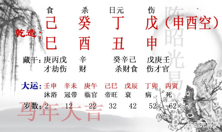 乾造:己巳,癸酉,丁丑,戊申(申酉空)