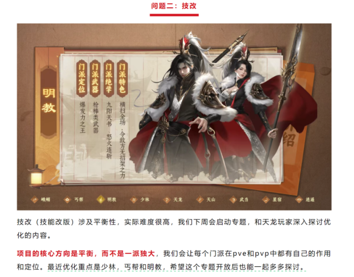直接点出了玩家戏称的丐帮三傻(明教、丐帮、少林),并明确表示,这三个门派就是近期的优化重点!这种态度,比说一万句我们会关注平衡性都管用。