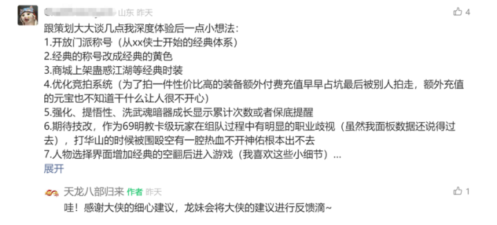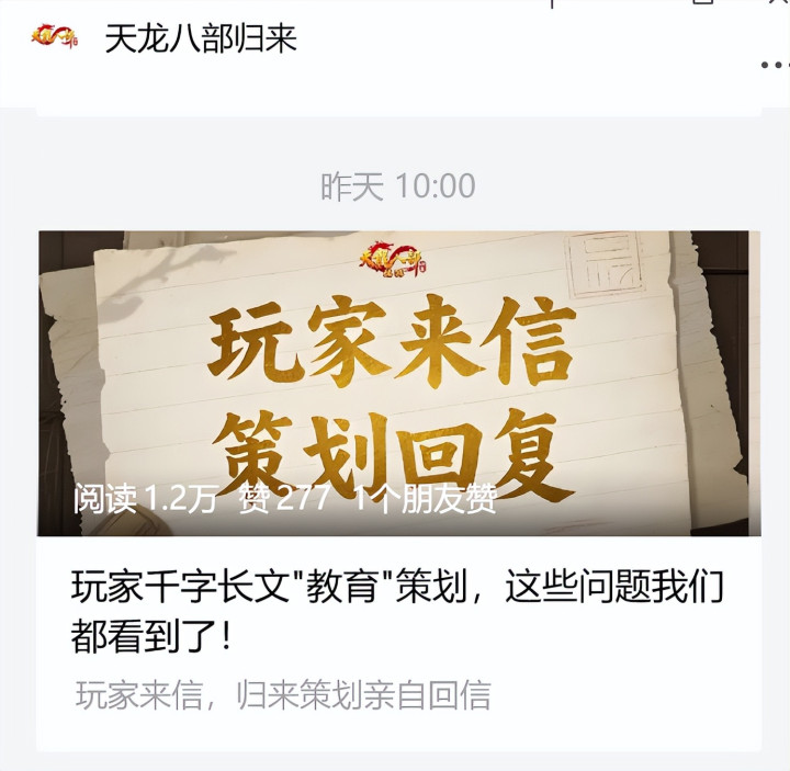 所以,前几天,《天龙八部·归来》端游的官方公众号,竟然挂出了一篇标题叫玩家千字长文‘教育’策划的推文时,我第一反应是:这又是哪门子的标题党营销?