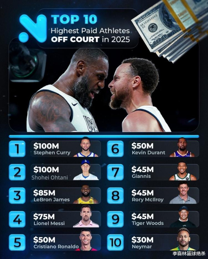 9月23日,美媒统计了2025运动员场外收入前十榜单,勇士球星库里和日本棒球明星大谷翔平以1亿美元并列排名第一。詹姆斯8500万美元排名第三,梅西7500万美元第四,C罗和杜兰特5000万美元并列第五。字母哥、麦克罗伊和伍兹都是4500万美元并列第七,内马尔3000万美元第十。