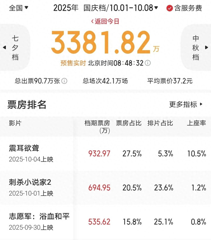 至于《志愿军3》,该片的前作票房突破了12亿人民币,成功登顶了去年的国庆档冠军。而现在的这部续集,预售票房表现还不如《刺杀小说家2》,预计最终票房想要达到6亿人民币都很难。
