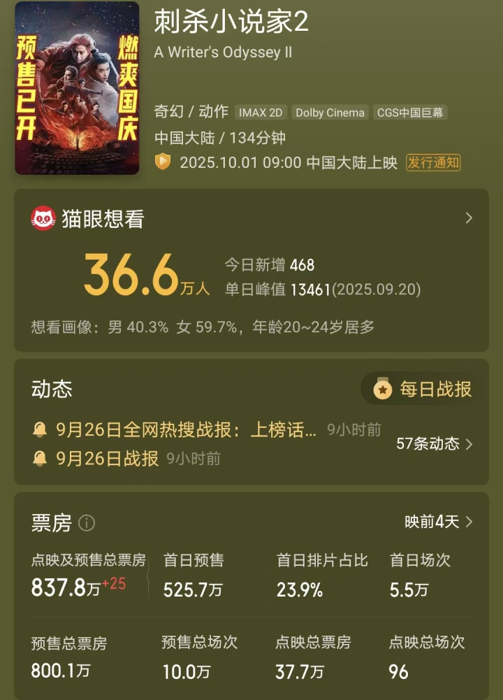 四天预售票房只有3000多万人民币,《刺杀小说家2》《志愿军3》两大续集之作预售成绩都很惨淡。