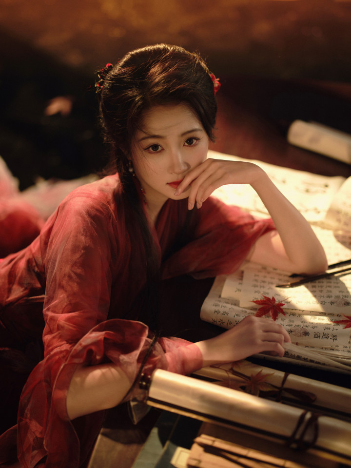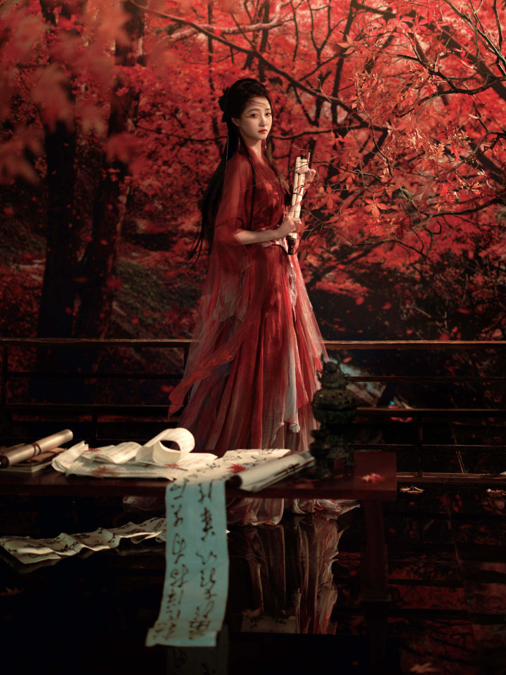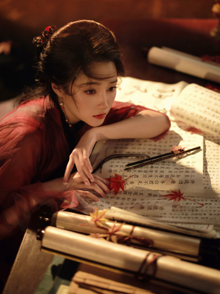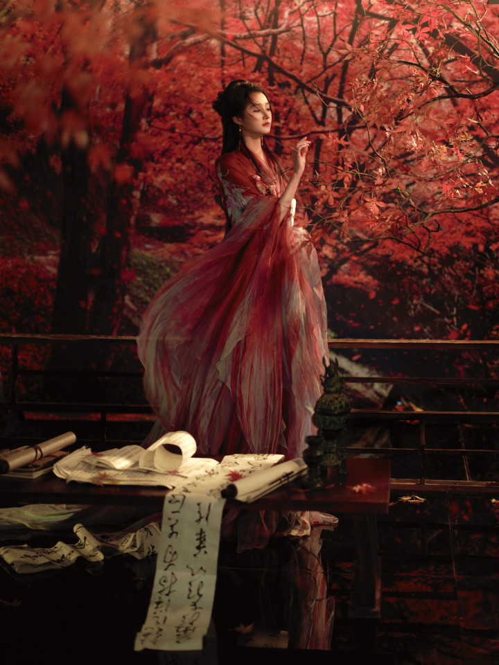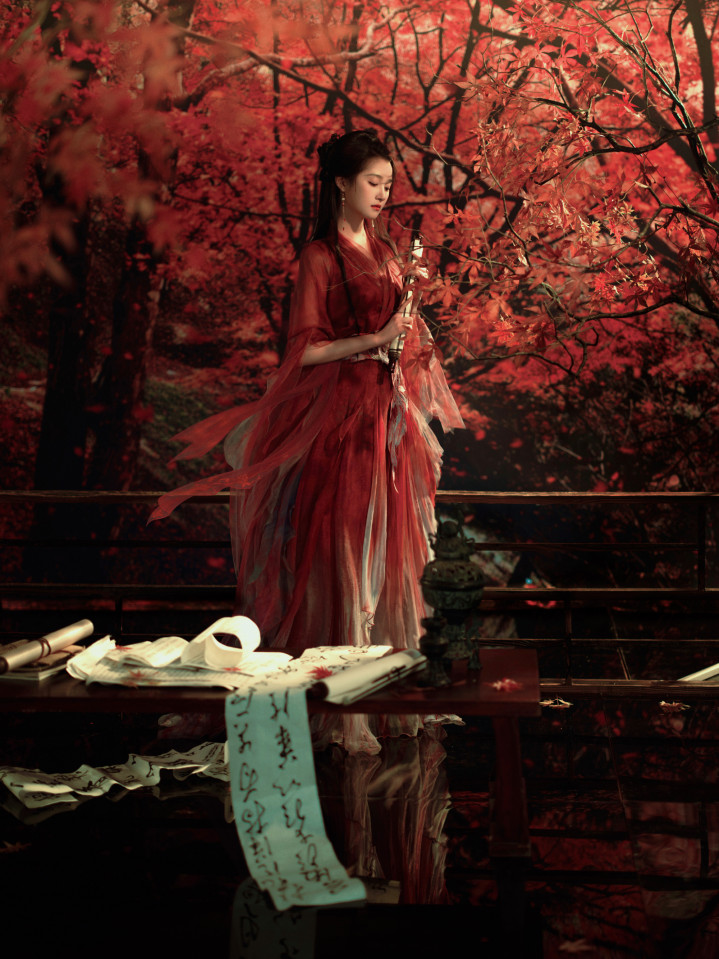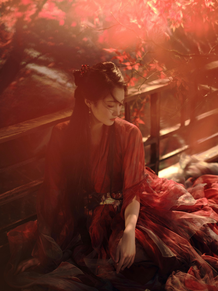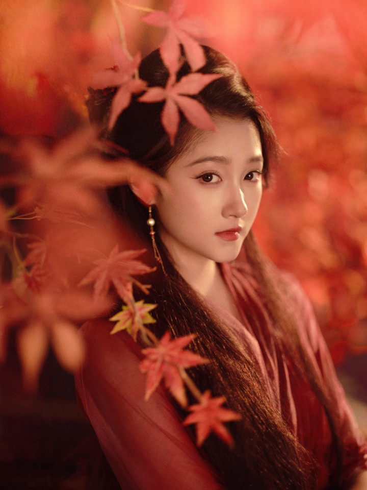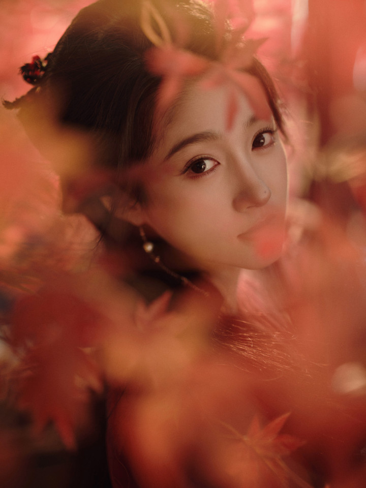 关晓彤枫叶林里, 身穿红衣的翩翩少女