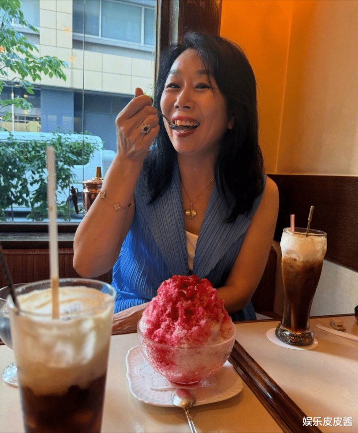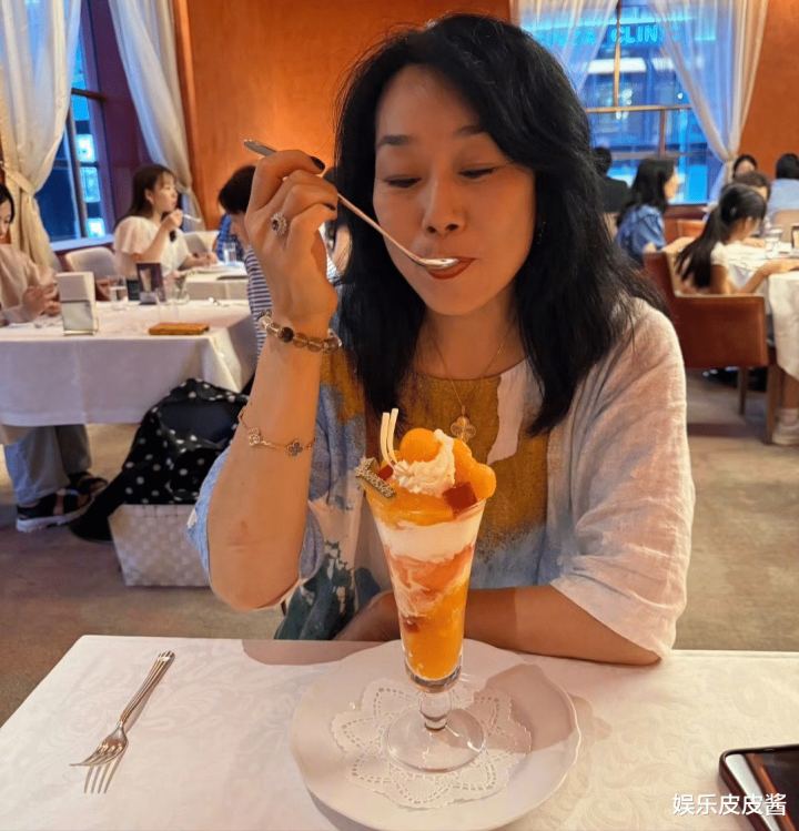 照片中,张馨予的妈妈吃着冰淇淋点心,其姿态非常的优雅,一看就是一个对生活的非常精致的人。
