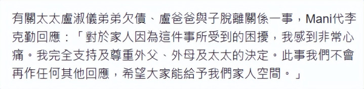 李克勤的妻子卢淑仪发声回应,称因为弟弟的债务问题,目睹年迈父亲晚年饱受煎熬,十分痛心,多年以来,全家已竭尽所能,多次为其处理债务,几乎倾尽所有但情况未见改善,与家人商议后才做出艰难决定。