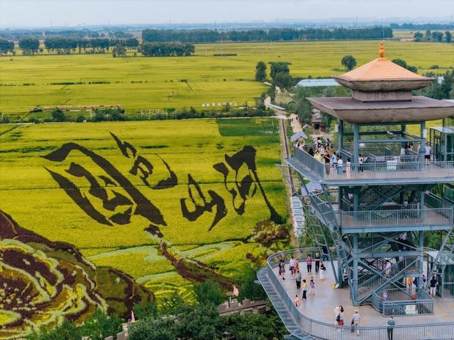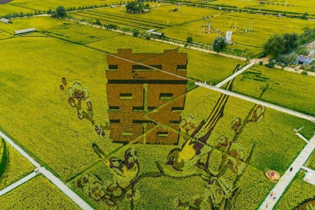初秋的辽宁沈阳郊外,一片广袤的稻田仿佛被施了魔法,登上高高的观景台远远望去,稻田不再是单一的金黄,而是化作一幅幅恢弘的“大地艺术画”——大大的“囍”字,以巨型牡丹为主体的“国色山河”……众多游客被这些巨幅的画卷吸引驻足拍照,并不时发出“好壮观!”“可真美啊!”的赞叹。